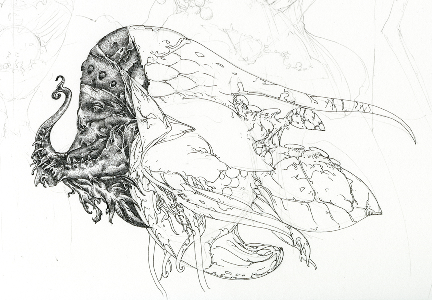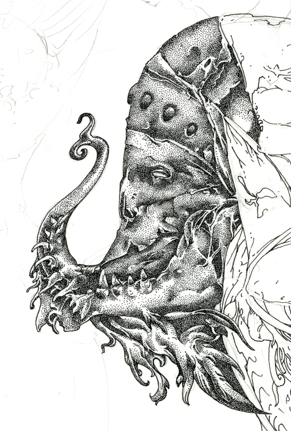 Here are two details from a new work in progress called Out of the Violent Planet. The title is a riff on C. S Lewis’s Out of the Silent Planet. In this detail you can see 3 stages of my process: pencil marks, outlining and rendering. Being pointillism, this piece will take some time to complete but I love to give monstrous figures a high degree of polish. There is something about working on a form in a highly focused way that lets you get beyond the pure gut reaction and lets you meditate on the beauty of form in a new way. The careful rendering also invites a more intimate experience for the viewer.
