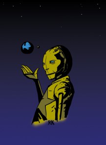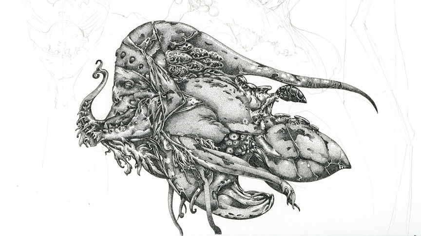 Here is a look at the progress on my piece Out of the Violent Planet. Lots of weirdness in this drawing. You are only seeing a small part of it here. As it progresses, I will be opening up the view.