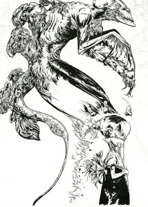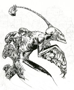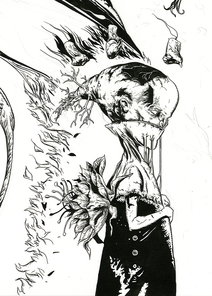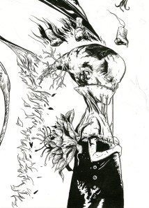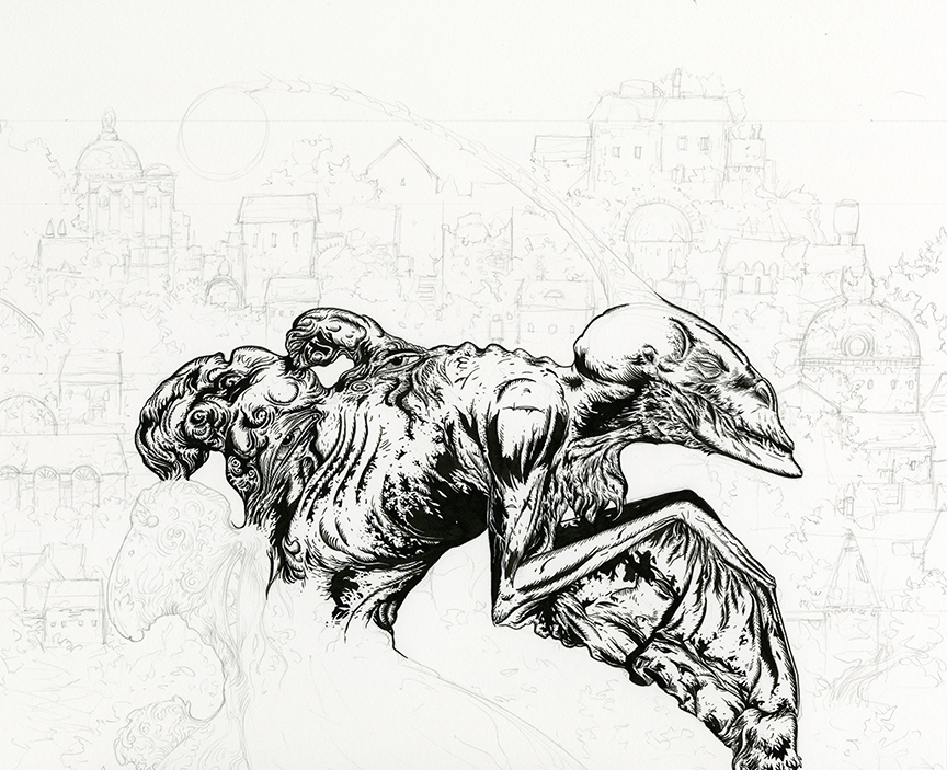 Here are a few work in progress images from my new drawing Insomnia. This one is black acrylic ink on paper. 22″ x 14″.
