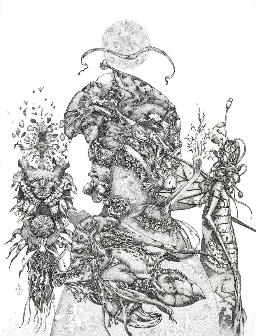 Out of the Violent Planet is a pointillism drawing rendered in ink. Tiny dots from a .18 Rapidograph technical pen are layered to create tonal values and line is used to define the form.