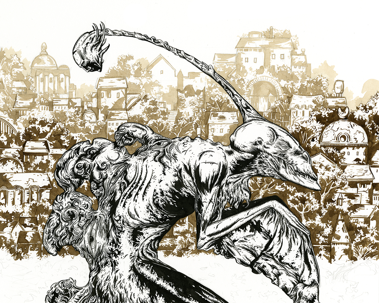 In this latest update on Insomnia, I finished the town in the background. I kept this fairly loose, using the sepia ink like watercolor. I wanted to leave some mystery. The town is empty but its citizens are awake.