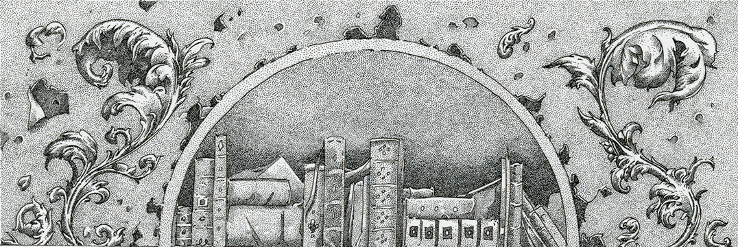 This is a work in progress scan of a new piece called The Drowned Library. I may be channeling a little bit of J. G. Ballard here with a dash of Borges. It is a commission piece and I’m enjoying a return to technical pen pointillism after a few weeks of working exclusively with brush (I realize that these are fairly well split hairs for the layman but this is my world).