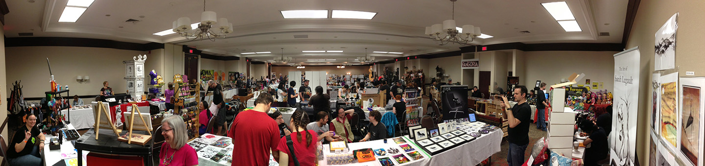 This past weekend we had the pleasure of attending Art O Con in Burlington, Ontario. The con was organized by Jaded Dragon Studios. A huge thanks to them for being so kind to us and making our experience so much fun. We caught up with some old friends and had a lot of interesting conversations over the table. Click on the panoramic shot to see how things looked just before the doors were opened. The Dalek in the second picture was actually pretty bad tempered even for a Dalek. I think when this was taken I was cowering under the table.