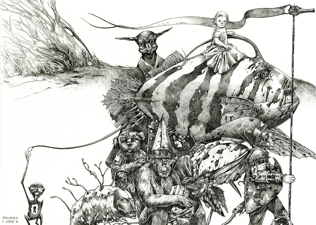 I did this drawing when my daughter was 3 years old. That’s her up on the top of the fish. Over the weekend I was looking through an old note book and found an entry that reminded me that The Fish Parade was the first drawing that I executed in a micro hatching technique with a brush. I use the technique quite often now. 9 years sure passes quickly!