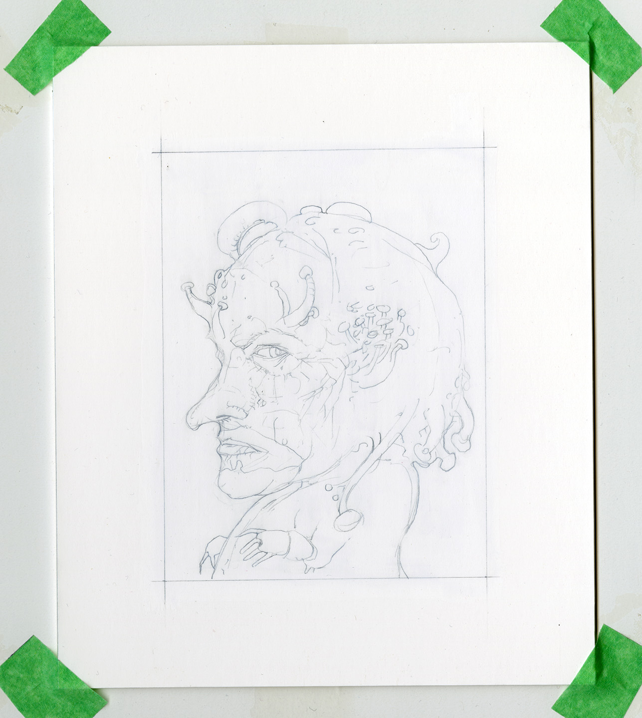 This is the graphite line drawing which will form the basis for the silverpoint drawing. It has been coated with 2 layers of white gouache.