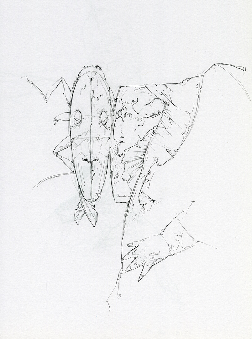 This fall I will have new artwork in a very special group show (I’ll talk more about the show later, once it has been properly announced). I’m planning two pieces for this show. To that end, I started a sketchbook dedicated to all of my ideas for these pieces. I find that it’s helpful to have one place for the drawings, so that I can refer to it easily as I work. Not everything will get used of course, but those ideas that don’t get used will seed other drawings down the road. Most will be graphite or pen and ink. I’ve posted a couple of the drawings from the book here so that you can see what I mean. I’m really excited with these new images.