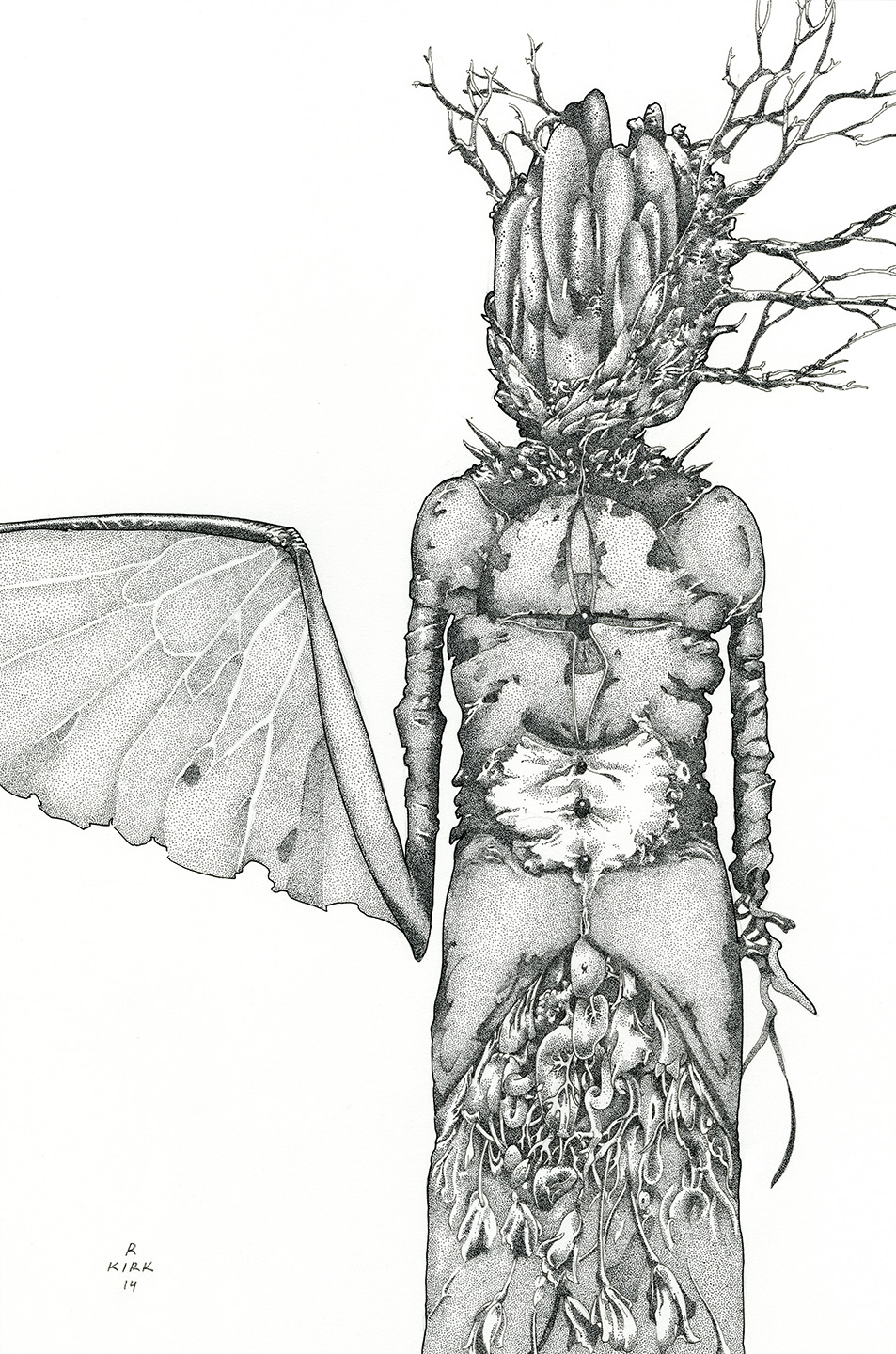 The thought behind this piece was to portray an entity that waits for the sleeper beyond the threshold of consciousness. The subtitle is “Awake for the Sleeper.” Appearances aside, the creature is not meant to be unambiguously malevolent. It is meant to represent the great unknown of our unconscious mind. The elements from which this creature is constituted are drawn from nature, things we might encounter – honey comb, branches, eyes, organs, insect wings. It is their unexpected juxtaposition, as in a dream, that unsettles us. Sinistral – meaning left-handed is a historic reference to otherness. To pass this creature, we must overcome our preconceived ideas. This is an idea that I am also exploring in my novel Necessary Monsters, so working on drawings like this can be thought of, for my purposes, as a kind of exploration for artistic works in other forms.