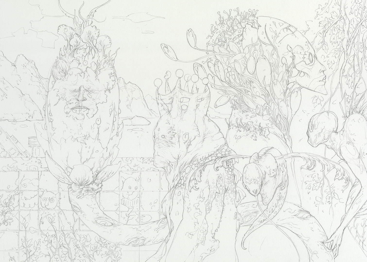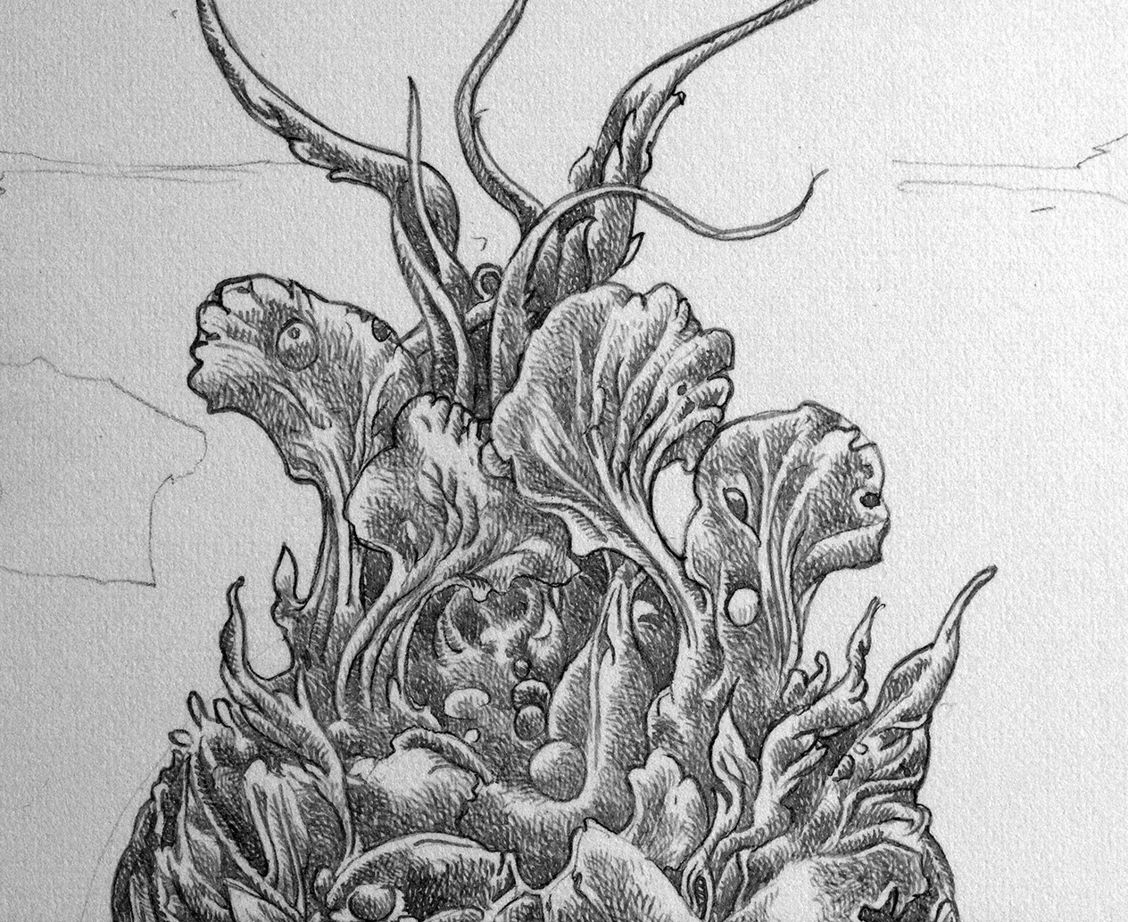 Here is a look at the drawing’s bones. What you see here will soon disappear under layers of ink. I find these line drawings have a beauty of their own, which is why I always take the time to make a high resolution scan of them before rendering.
