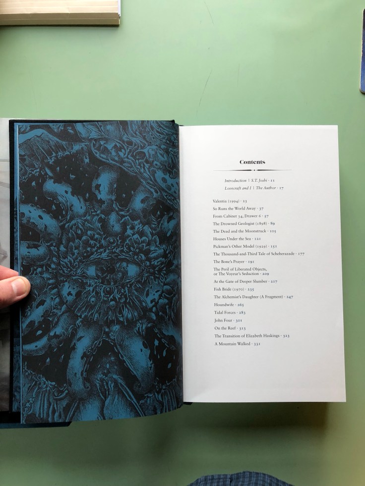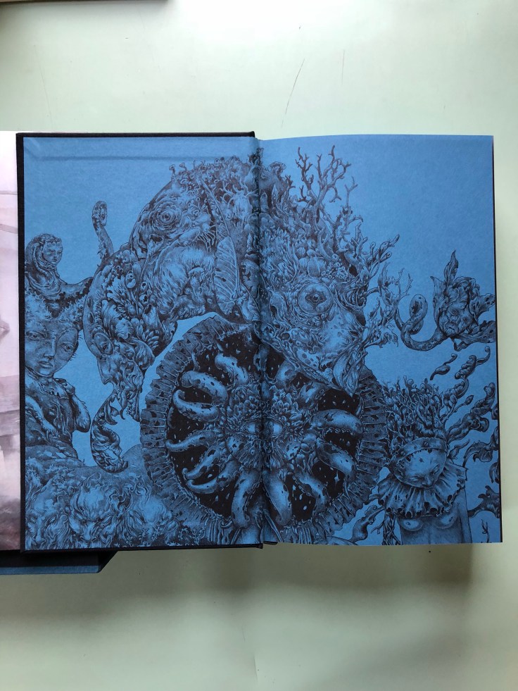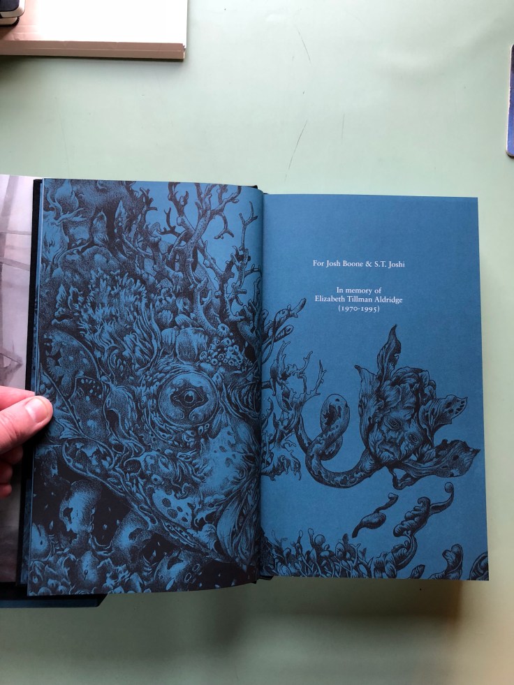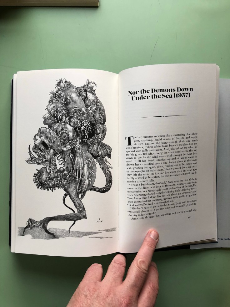 This is an illustration for one of Caitlin R. Kiernan’s short stories in the recently published Houses Under the Sea (Centipede Press). I’m showing the image in its original state because I like the warmth of the off white Arches paper (the file submitted to the publisher was altered for printing). The finished book is beautifully made. Below are a few snaps so you can see how the artwork was incorporated into the design.