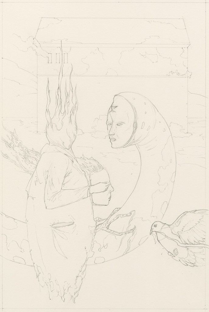 I started working on this new piece today on a block of 140lb Arches hotpress. Tomorrow I’ll start the real work of rendering the image using diluted inks to model the forms. As I go along, I’ll post some progress shots here on the blog. Although I did many works with this technique in the past, its been a few months, so I’m looking forward to it.
