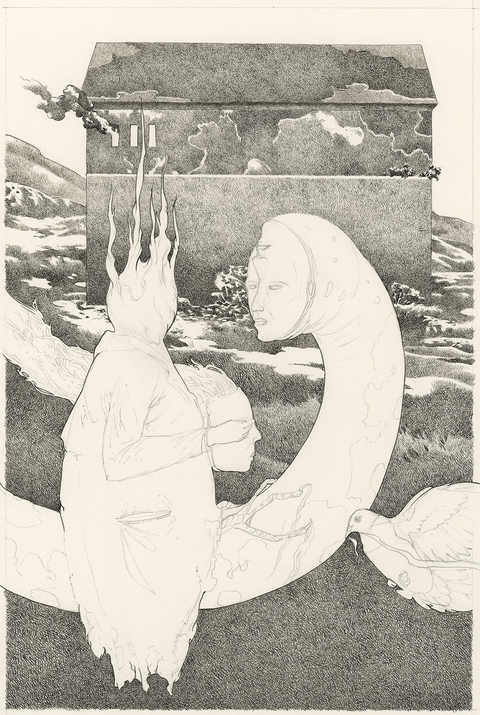 The past week was spent working on the background of this piece. It was rendered in ink using a fine brush to make cross-hatch marks, layering for the dark area. I’ll start the figures tomorrow.