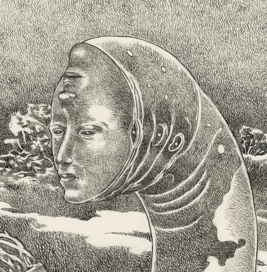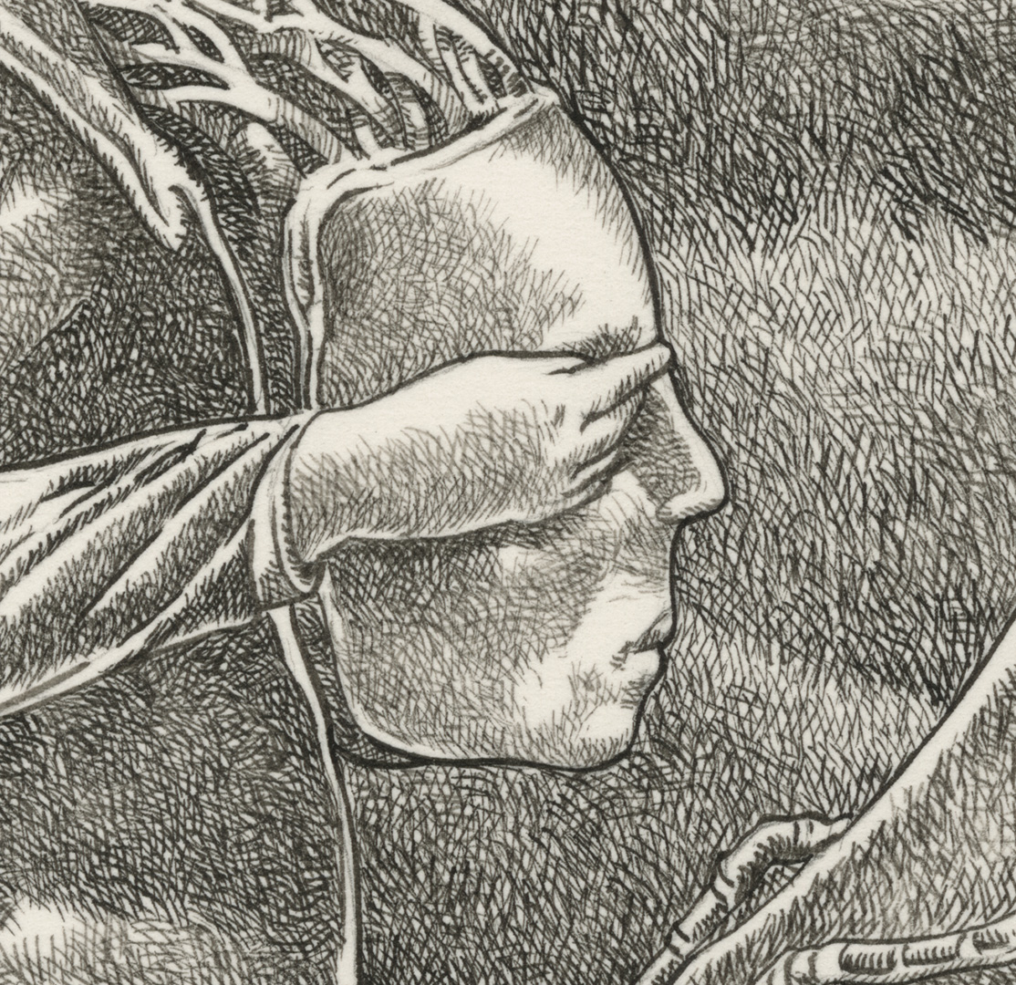 One might be forgiven for thinking this piece a surrealist response to Aubrey Beardsley’s illustration, The Examination of the Herald from Lysistrata, but it is in fact a meditation on vision (see previous posts). I hope you have enjoyed watching this process. This work is available for purchase. Please message me with any questions.
