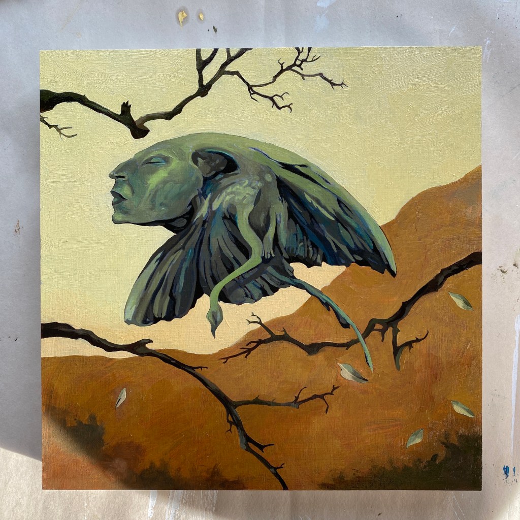 It’s been a busy week. I’ve been working steadily on Harbinger (see previous post), and on this series of oils (below). These are rough and ready iPhone images off my drawing table and once they are properly finished I’ll put some better shots on my website. Birds and flight seem to be the central theme. I hope you like these in-progress views. I’m really enjoying interspersing my other work with these color pieces. The largest, Cardinal, was actually started the summer of 2019 and had to sit in the studio for a while while I attended to other things. It’s great to finally get back to it. These works will be available for purchase once they are finished, dried and varnished.