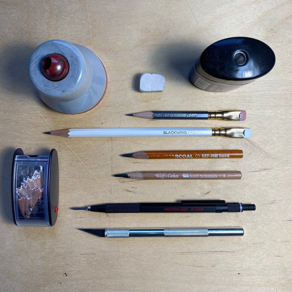 This week I also finished a new illustration for my “Big Illustration Project”—sorry, can’t share yet. I’m creating these illustrations with a combination graphite, carbon and charcoal. Tools of choice are Blackwing 602s, and Pearls, Wolff’s carbon and Generals charcoal. All of them are a complete headache to keep a point on! I think I spend as much time sharpening as I do shading. No matter, every technique has its challenges and the results in this case are interesting indeed. Using the Blackwings for the light and medium values and the Wolff’s and Generals for those areas where I really need to lay in the darks.