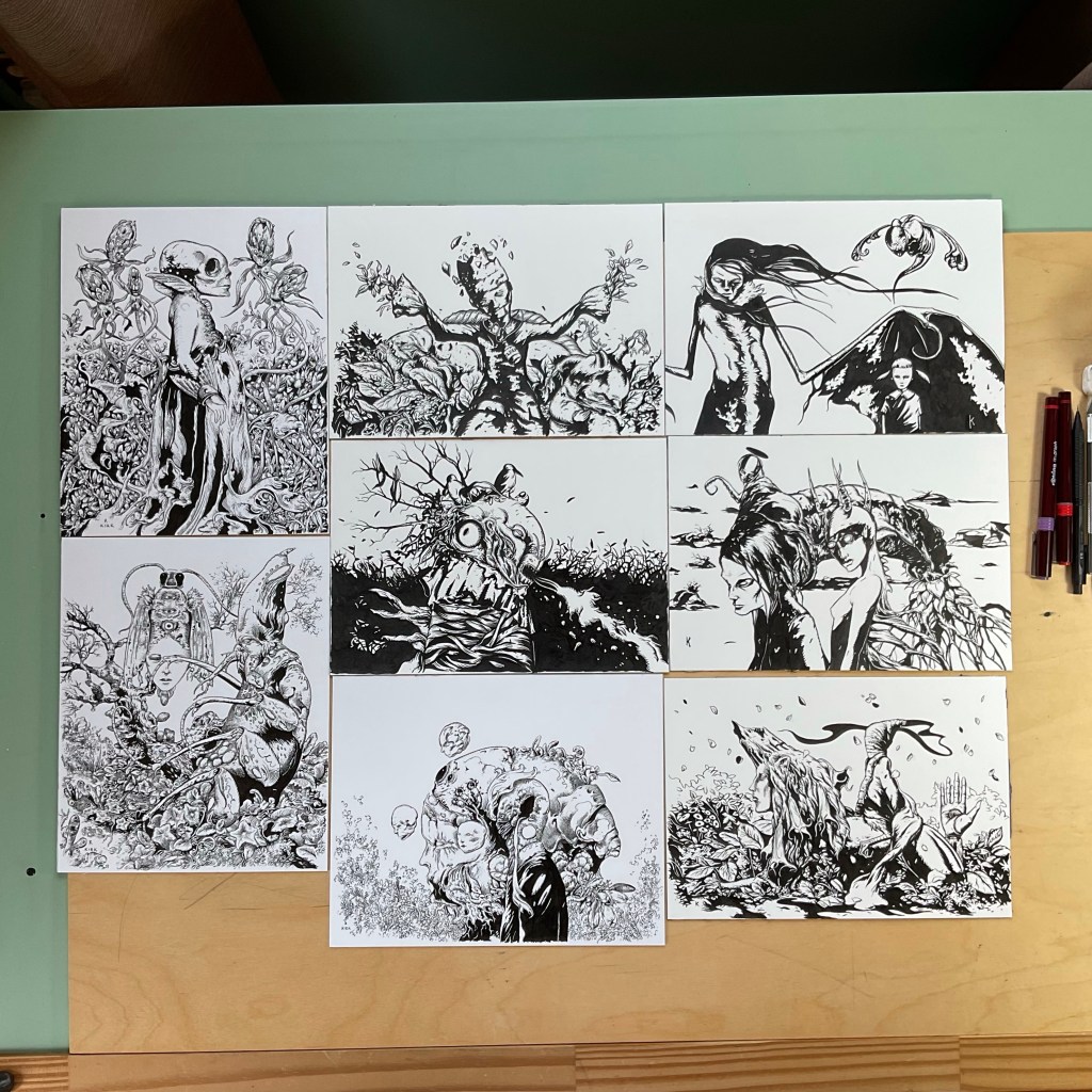 Over the past few years I’ve been pecking away at a series of works I’m collectively calling The Devil Tree. Some of these might be familiar—at least two have been offered as prints, and another was reproduced in my Darkling Lands 1 booklet. The picture below is a collection of these works. All of them are done in ink, with dip pen, brush or both. There are a couple of larger works associated with this project, which aren’t shown here. Once I hit a critical mass of images, maybe 20 or so, I plan to produce a kind of free form graphic novel. Free form in the sense that there is no over-arching narrative. Instead, the works are intended to evoke rather than instruct. I believe that physically collecting them together will create a unified experience. Anyhow, that is a while off, so I thought it would be fun to lay them out to show what I have so far. Hope you enjoy them.