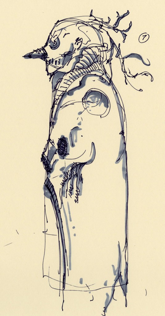 My favourite design tool is the humble Ultra Fine Black Sharpie marker. You can buy them by the box from Staples (or any office supply place). When I want to generate a bunch of ideas, I sit down with a Sharpie and a pile of copier paper, or some inexpensive equivalent. The idea is to remove mental blocks or friction and give free reign to the imagination. I don’t try to clear my head or exert conscious influence on the pen in my hand. I simply draw, letting my instincts guide the line. The critical process of selection and refinement comes later. This Sharpie step is similar to the shitty first draft approach to writing. I thought I’d show you three of the Sharpie drawings the the finished work that came out of them. Do you have any go-to techniques for prying ideas out of your imagination? Feel free to share them in the comments.