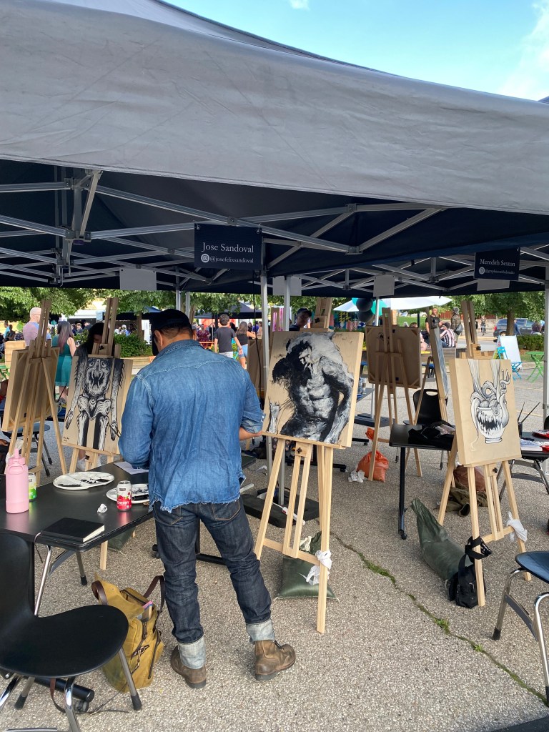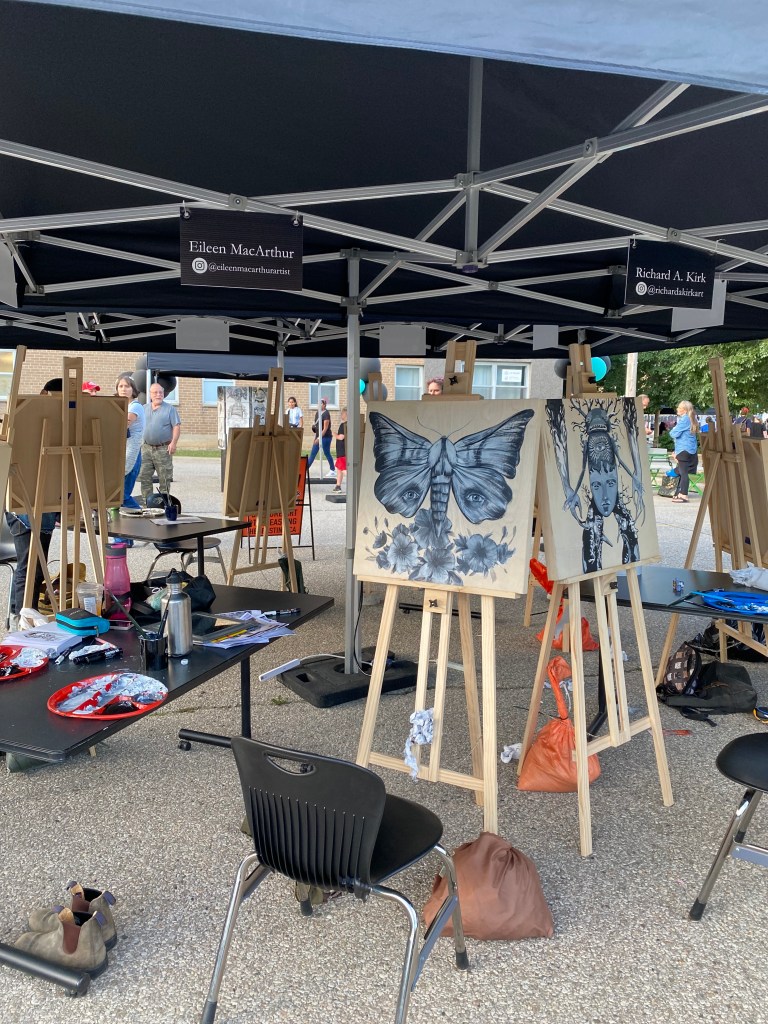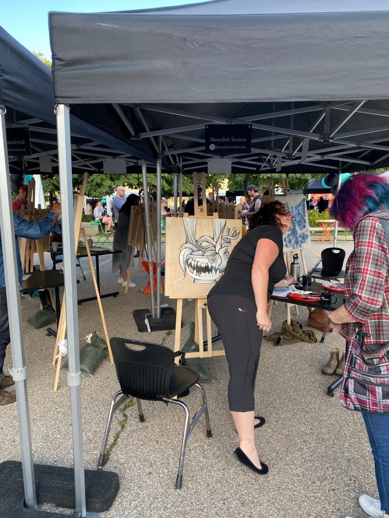 How did it go? I have to say, this event was a riot. Public painting is so hilariously outside my wheelhouse, I knew I had to do it. The other artists were amazingly talented and fun to hang with. The evening was warm, the music motivating thanks to a post-punk/ goth playlist, the air full of interesting snatches of conversation and street food. Honestly, I was just happy to be there as this was the first public art thing I’ve attended since covid. I may have been a little ambitious with what I want to achieve, but in the end I was fine with the result. Fun was had by all.