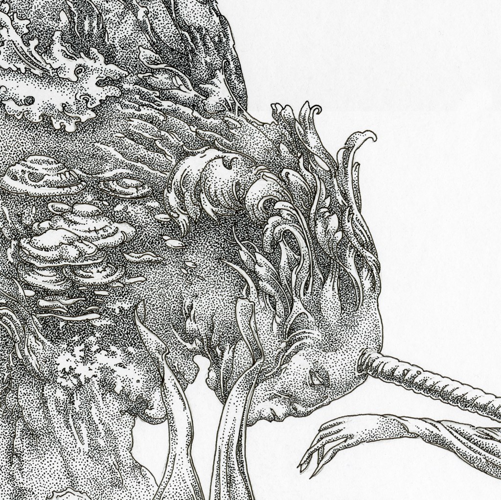 “Secret Affinities” is my first completed drawing of 2025. It tips the hat to a couple of my favourite artists—can you identify them? The idea for this picture came from a small sketch of a witch that I did a few years ago. In this image, I drew her with her with a prominent left hand (the other hand is hidden, or maybe non-existent). As a leftie, I am sensitive to the tradition of negative connotations in art and religion regarding the left hand. In this image, it is represented as a source of power, juxtaposed with the unicorn’s horn, a symbol of the divine power that nurtures all living things. The witch’s dress contains her ancestors, an idea that may have its roots in my multiple readings of Dune while I was illustrating it a couple of years ago. The small figure to the extreme right is a nod to the T-Rex album “The Slider”.