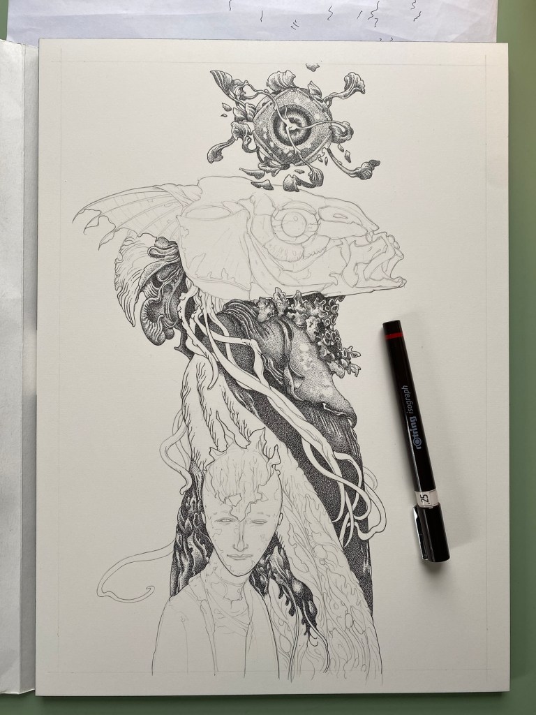 Closing in on the end of the piece. The carp skull was the slowest part of the drawing because I wanted it to be accurate, but merge with the other elements of the form at the edges. The ball in the eye orbit echoes the centre of the Neolithic ball above.