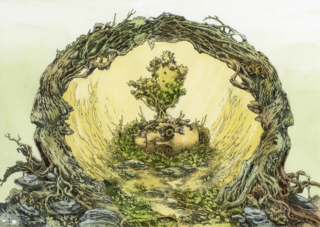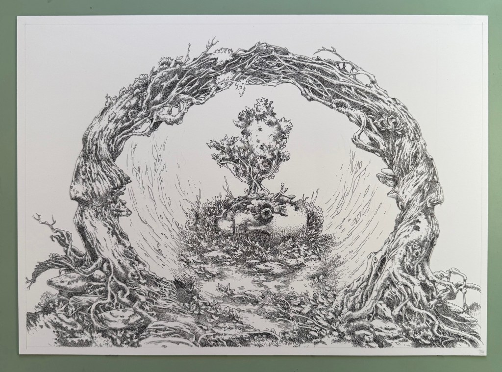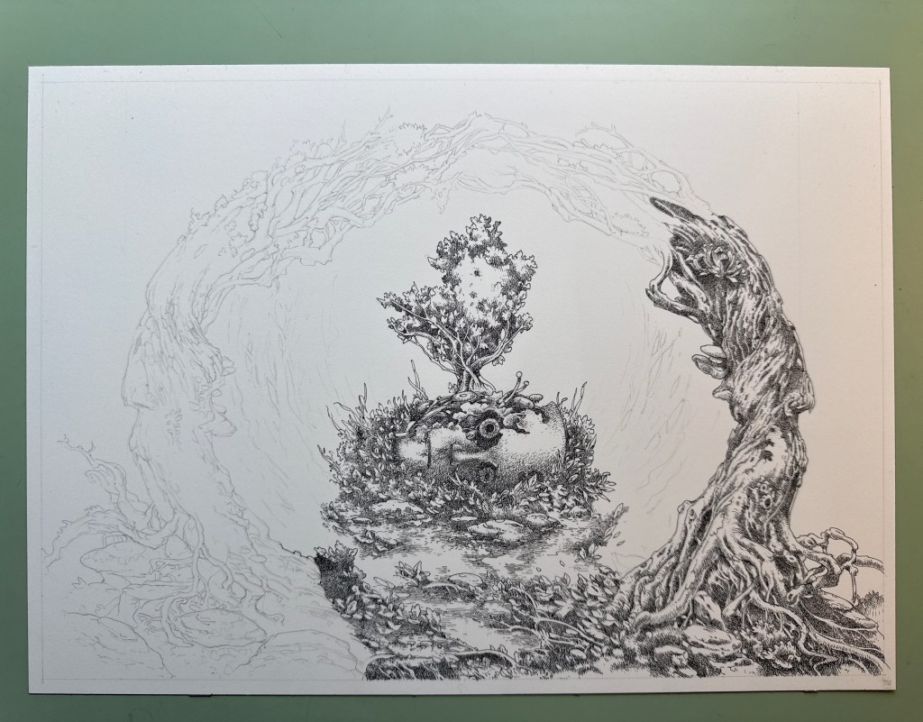 I finished a new water colour and ink piece this week called Aqueous Humor. I drew the image in ink on 140lb Arches hot press paper with a dip pen and tinted it with water colour washes. There are a couple of process shots below, taken with my iPhone. The Arches paper is perfect for ink work, offering just enough resistance to the pen nib. It also took the washes very well. The piece incorporates some of my favourite themes: decaying technology and fantastical natural settings. At the time of writing, Aqueous Humor is available in my Big Cartel shop along with many other recent studio works.